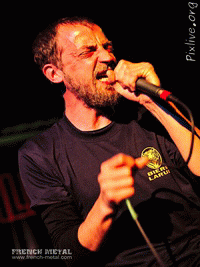 Pour ma première soirée organisée par l'asso Corrosive de Strasbourg je ne suis pas surpris par l'accueil et la bonne ambiance puisque ce ne sont autre que Manue et quelques acolytes de feu Common'aim, asso très active en son temps, qui gèrent les manettes. La salle est cependant dans une configuration inhabituelle car au lieu d'utiliser la scène, c'est une petite estrade plus basse et en avant qui portera les groupes. Qui dit pas de scène dit pas de lumière ou presque ! En effet, c'est en tout et pour tout deux spots jaune et bleu qui assurent l'éclairage. Ambiance intimiste pour sûr mais pas des plus idéales pour les photos...
