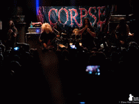Les morceaux s'enchaînent et la communication avec le public se limitera, lors des premiers morceaux, juste à la musique, jusqu'au moment où, à la demande du groupe, nous allons chanter un "Happy Birthday !" à George "Corpsegrinder" Fisher (chant), qui semble apprécier cette attention du public français. Mais soyons sincères, le public n'est pas là non plus pour entendre des discours mais pour en prendre plein les oreilles, se donner à fond avec des pogos, et se dégoter un bon torticolis avec du headbanging intensif et profiter à fond du passage de CANNIBAL CORPSE par Paris.