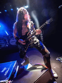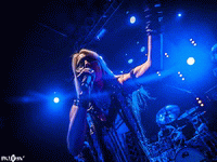 Petit changement de plateau, l’occasion pour la foule de scander à plusieurs reprises le nom de la Reine (un zozo monte même sur scène hurler et haranguer la foule) et pour moi de constater que bon nombre ne sont pas français (néerlandais, allemands, voire même brésiliens), c’est dire le vivier de fans "die hard" de la belle, prêts à la suivre partout pour célébrer dans la fête cet anniversaire. On attaque donc, sur une scène épurée, avec une arrivée au compte-gouttes des musiciens puis de la belle sur l’intro de "I Rule The Ruins". Ce soir, point trop de nouveautés puisque pas d’album à promouvoir. Il s’agit d’une tournée anniversaire, donc essentiellement composée de hits de la grosse époque de Warlock pour le plus grand plaisir des "papys metal" de la salle mais aussi, plus étrangement, d’un bon nombre de fans beaucoup plus jeunes. Pas de place à l’impro et aux temps morts ce soir car la Reine semble une fois de plus sous extas ou une autre substance euphorisante (les remerciements hystériques entre chaque morceau… Pour l’avoir eue en interview, elle me fait plus peur que n’importe quel musicien de musique extrême) et ce ne seront pas moins de 16 titres qui seront joués, dont évidemment beaucoup de vieux titres comme "Burning The Witches", "Fight For Rock", "Evil", "Für Immer" ou encore "Metal Racer". Il faudra aussi compter sur quelques compos plus récentes comme "Night Of The Warlock", jouée relativement tôt dans le set, accompagnée de lumières rouges soulignant les crânes entreposés sur les têtes d’amplis, et le fameux "Raise Your Fist In The Air", devenu pour l’occasion française et avec un fort accent teuton "Lève Ton Poing Vers Le Ciel" repris à sans briser la voix par une assemblée suffisamment vieille pour ne pas avoir appris en son temps l’anglais au collège. Avant d’attaquer la triplette finale de reprises, on aura quand même le droit à un beau solo de batterie de Johnny Dee, le temps que tout ce petit monde se réhydrate convenablement. Fin en apothéose avec "Egypt", reprise du titre culte de Ronnie James Dio, grand ami de Doro, qui l’a déjà dépanné sur l’écriture de certains titres, et aussi de "Breaking The Law" de Judas Priest, l’une des reprises incontournables de la Reine sur cette tournée (parfois au tempo très lent, ce que je trouve d’un chiant pas possible).