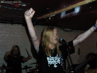 SANGUINUS s’est rapidement mis en place. Je les avait en fait déjà vu en première partie d’Hypocrisy il y a quelque mois de ça, toujours à Glasgow. Et ce qui m’était resté en souvenir comme un jeune groupe trop raide et peu convaincant m’est apparu ici comme un fuck’n kick’n ass band !! (en écossais phonétique ça donne facké kikénass bând !) Ce soir, ils jouaient devant leur public, leurs potes étaient là et balançaient des tas de vannes dans un accent Ecossais incompréhensible. Bon, j’ai sourit pour faire style mais j’ai vraiment rien capté… Bref, ils étaient à l’aise et avaient vraiment envie d’en découdre. Le son de gratte ressemble de temps en temps à celui de Lamb Of God, mais on a du mal à déterminer si la voix est thrashisante ou deathisante. Le batteur là aussi est très bon et son jeu est élaboré, avec des roulements et bien de la cymbale comme je l’aime. Nous avons eu droit à une toute nouvelle chanson répétée seulement pendant les balances, et c’était de loin la meilleure du show !! Voilà, conclusion de SANGUINUS : du pur crushing thrash and death et un groupe qui j’espère sortira des faubourgs Glaswégiens.