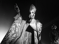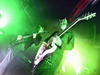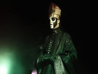 Faisant enfin leur apparition, suivi d'une entrée théâtrale de Papa Emeritus III, le groupe attaque avec "Spirirt", qui met déjà dans l'ambiance, puis avec le single "From The Pinnacle To The Pit" qui fait un carton. L'ambiance durant tout le show sera dingue : le public est enthousiaste, entièrement dévolu au sextet, il chante à fond les refrains et répond toujours favorablement aux saintes paroles de Papa Emeritus III ou à ses gestes solennels. Seules incursions dans le premier album (éponyme !), "Ritual" est acclamé comme le messie et "Con Clavi Con Dio" recueille de très, très bons suffrages. Après "Per Aspera Ad Inferi", Papa se lance dans sa première grande prêche. C'est l'occasion d'apprécier l'humour sérieux du pape à l'accent faussement italianisant. Le souverain diabolique (qui assurera une bonne prestation vocale ce soir) invite ensuite les Sisters of Sin (deux très belles jeunes femmes déguisées en nonnes, en fait des fans ayant candidaté sur Internet, les protagonistes changent de ville en ville) à monter sur scène. Grand moment lorsque Papa ne sait plus où donner de la tête pour organiser leur descente, cela laisse place à cinq minutes de rire d'anthologie. Une fois les sœurs descendues de scène pour faire boire dans des calices du sang aux premiers rangs, le très à propos "Body And Blood" est joué. Papa change de costume, échangeant sa soutane et sa tiare pour un élégant costume soirée en queue de pie. Puis, l'avalanche de hits déferle avec "Cirice" et son riff génial, le céleste et très disco "Year Zero" et enfin "He Is", ballade pop qui reçoit un accueil phénoménal ! La paire diabolique et surheavy que constituent "Absolution" et "Mummy Dust" (ce dernier étant beaucoup plus pêchu en condition live, déclenchant pour le coup le seul et unique pogo, assez "violent" d'ailleurs) fait un malheur et réveille nos instincts primaires. Le long et progressif "Ghuleh/Zombie Queen" fait tout doucement monter la sauce jusqu'à exploser sur sa seconde partie. GHOST délivre un concert vraiment varié, n'hésitant à changer les couleurs et les ambiances au gré des titres pour un résultat très pertinent. Preuve en est, la reprise du psyché "If You Have Ghosts" calme le jeu et se révèle être un moment fort du concert. Ce titre, définitivement adopté par les fans et classique du groupe bien qu'elle ne soit pas l'œuvre du groupe est un bijou et sa version live est superbe. Le révérencieux "Monstrance Clock" clôt la cérémonie de façon traditionnelle désormais pour GHOST.