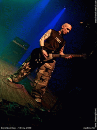 Le nom a changé, mais le son reste le même : ERYN NON DAE. (ancienement END.) revient jouer dans sa ville natale après avoir quelques dates en Europe. Quelques minutes d’intro sample pour nous plonger dans l’ambiance sombre et pesante propre au groupe, puis les musiciens montent sur scène pour intérpréter une musique du dernier opus ("Hydra Lernaïa", 2009), "Blistering Hate". En quelques minutes, le ton est donné : la batterie bombarde un rythme que la basse accentue et alourdit alors que les guitares imposent sons malsains et mélodies derangeantes, la voix aspirée (et oui, aucun groupe n’est parfait !) vient brutaliser le tout avec ses cris incessants. C’est avec les plus familières "Existence Asleep" et "Enigma Of The Unknown" (tirée du maxi "The Never Ending Whirl Of Confusion") que se poursuit le set. Difficile de distinguer où commencent et où finissent les chansons puisque le silence ne trouve jamais sa place dans le set, durant lequel groupe enchaîne musiques et "atmoshpères" (samples, larsens,…). Quelques autres chansons de l’album sont jouées devant les pogos du public avant que les toulousains ne laissent place à HACRIDE. Et au final, les opinions sont comme toujours divisées : alors que certains trouvent le set long et répétitif, nombreux sont ceux qui adhèrent complètement et sont séduits par l’univers du groupe. Dans tous les cas, il est certains qu’ERYN NON DAE. ne laisse pas indifferent !