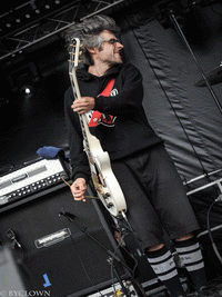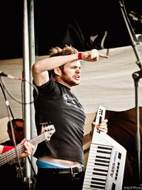 COLLAPS MACHINES, je les ai d'abord entendus de loin, depuis le camping. Mais il faut dire que leur son était tellement fort, et qu'il motivait tellement, qu'il était impossible de faire l'impasse dessus ! C'est donc dans l'empressement, que la plupart des campeurs se sont rués vers le site qui, forcément, bouchonnaient à l'entrée. Mais fort heureusement, on se rapprochait de plus en plus de ce son qui semblait nous appeler, nous attirer comme des aimants. Et pourtant, ce fut un défi relevé et remporté, car il n'est jamais facile d'ouvrir un concert, surtout en début d'après-midi, lorsque la plupart des festivaliers déjeunent encore ou bien jouent les feignants. D'ailleurs, il faut admettre qu'il faisait relativement frais dehors, et puisque leur musique réchauffait, nulle excuse était acceptée. Et finalement, le public ne s'est pas ennuyé. Quand bien même il y en avait qui restaient sur place sans bouger, ils ne faisaient en fait que découvrir et apprécier la musique. Les musiciens étaient particulièrement concentrés, tous, sauf le chanteur. Lui, il était à fond dans son trip. Il a joué le jeu de scène du début à la fin. Il a tout donné, ça on ne pouvait pas le lui reprocher. Après, COLLAPS MACHINES on aime ou on aime pas, mais commencer par ce style en ouverture, ce n'était pas une si mauvaise idée. Ca permettait de se plonger immédiatement dans l'ambiance, et de se mettre en condition pour le reste de la journée qui s'annonçait fort prometteur. Alors entre ceux qui les ont entendus de près, et ceux qui les ont entendus de loin, la différence n'était pas si grande puisque le mouv' était le même ! Allez, un petit encouragement les gars !