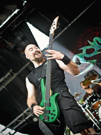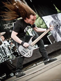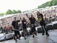 Après le grind totalement déjanté de nos amis allemands d’EXCREMENTORY GRINDFUCKERS, c’est sous un ciel presque bleu et avec un réel plaisir que je retrouve sur la Dave Mustage les petits gars d’HACRIDE. Bien trop de mois ont passé à mon goût depuis leur dernier concert parisien au Divan du Monde avec la Klonosphere et je redécouvre donc ce groupe en version 2.0 car un remaniement de line-up a été opéré il y a quelques mois (nouveau chanteur, nouveau batteur qui est également celui de Klone). Musique tantôt planante voire progressive ( bon ok, on en est pas encore au niveau d’Ataraxie ! ), le pari est osé de se produire devant un parterre majoritairement composé de gros bourrins venus headbanguer et se chamailler sur des groupes comme EXODUS, VADER ou encore DYING FETUS, mais qu’importe le quatuor est là et bien décidé à en découdre afin de consolider sa réputation et surtout de mettre en avant son nouveau line-up !! Dès le premier morceau le ton est donné de la plus belle des manières ! En plus d’un son impeccable, d’un temps clément et d’un horaire de passage favorable à une bonne audience, le combo fait preuve d’une incroyable énergie sur scène qui vient consolider leurs compos relativement singulières. Le nouveau chanteur n’a absolument rien à envier à l’ancien, que ce soit au niveau vocal ou scénique (d’ailleurs, sous bien des aspects il me rappelle Bjorn Strid de Soilwork) et le batteur est juste un monstre, avec une frappe qui me fait me demander comment il fait pour ne pas casser ses baguettes au bout de 5 minutes !! Contre toute attente, vu le style musical, le public répond présent, que ce soit par les applaudissements mais aussi, et surtout, dans le pit qui s’embrase à des moments pourtant relativement calmes et lourds (une vidéo amateur de "My Enemy" est disponible sur la toile, qui illustre bien mon propos et qui montre que ça headbangue sévère sur scène !). Pendant une petite heure on aura vécu une fois de plus la communion entre un groupe et le public (un public qui n’est pourtant pas SON public, voilà bien la hache à deux tranchants qu’est le show en festival
