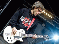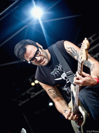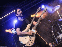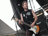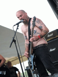 Parlant de sourire, voici que montent sur scène les Américains de THE MONDO GENERATOR avec, à leurs côtés, Nick Oliveri (Queens Of The Stone Age) et sa basse salie par de plus que nombreuses prestations et probablement pas mal d’afters ! Son un brin saturé : check ! Ambiance rusty : check ! Le Moto’ s’encrasse un peu pour faire place à l’univers stoner "South Made" du groupe le plus hybride et le plus intuitif de cet après-midi. Les plus nostalgiques d’entre nous les attendaient, eh bien les voici, Nick, torse nu, veines du cou prêtes à exploser devant tant d’intensité mise dans la voix qui accompagne sa basse aussi bien pour des reprises de Kyuss "Allen's Wrench", que des reprises aussi cultes que celles de Queens Of The Stone Age "You Think I Ain't Worth A Dollar, But I Feel Like A Millionaire"... On s’aperçoit rapidement que leur univers musical mélange assez habilement ces inspirations stoner dont j’ai parlé plus haut et des influences "punks" (à prendre avec des pincettes) assez virulentes tant dans les textes que dans l’accroche mélodique de leurs morceaux comme sur "Won’t Let Go" où les slams un peu rouillés commencent à se voir remplacés par des langues tirées derrières des crêtes parfois colorées qui commencent à se faire plus nombreuses et pour cause... à peine le groupe sorti de scène que voici le tour d'EXTREME NOISE TERROR...