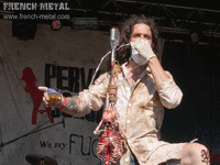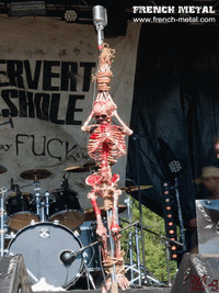 PERVERT ASSHOLE, ou les trous du cul pervers… Avant même leur arrivée sur scène, la déco annonce la couleur, un squelette ensanglanté pendu au micro, et des espèces de têtes écorchées avec des sexes masculins qui en sortent. Des samples de jouissances féminines en guise d'intro, vous l'avez compris ce set ne plairas pas aux oreilles chastes ! Il faut avouer que visuellement ça claque... Le chanteur en blouse médicale ensanglantée, jettera des verres de Whisky au public, et nous fera même un petit strip tease, offrant à nos yeux son caleçon sale... Évidemment ça ne pouvait que me plaire ! Musicalement par contre c'est un peu moins riche et j'avoue que je retiendrai surtout leur prestation visuelle, mais sur moi ça a bien fonctionné puisque j'espère les revoir sur scène .