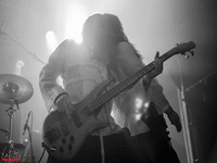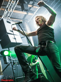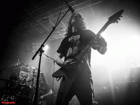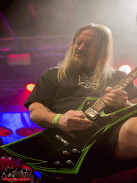 Le son est trop fort pour ce concert, et n'est pas parfait. La batterie surplombée de Ron Lipnicki (on ne le voit presque pas) couvre une bonne partie du reste. Mais cela ne nous empêche pas de passer un un fantastique moment. "Hammerhead" fait déjà rugir les fans de plaisir, accueillant les Ricains avec une putain d'énergie que le groupe renvoie directement dans nos tronches tel un boomerang. Bobby enlève déjà sa veste et dessere même sa ceinture devant le premier rang ! "Electric Rattlesnake" est un des grands moments de la soirée. Dave Linsk, scéniquement discret, brille sur ce morceau. Le guitariste à la longue barbiche, tout sourire, sort des solos de malade, sur ce titre, mais aussi sur les autres morceaux. Ce type a huit doigts, c'est pas possible ! On s'étonne de ne pas entendre plus d'extraits (seulement deux chansons) de "White Devil Armory" sorti il y a moins d'un an. Le groupe a décidé, sur cette tournée, de privilégier ses classiques des années 80, ce qui n'est pas pour déplaire aux fans des Américains. Ces derniers nous balancent pour le coup trois compos issues de leurs années de gloire, "Powersurge", "In Union We Stand" (prétexte à une longue participation du public), et "Rotten To The Core". Les fans sont ravis et nos cervicales aussi. "Bring Me The Night", au riff tournoyant, fait aussi un carton. DD (plutot décontracté sur scène) et Derek (remuant et exortant les "french motherfuckers" à se donner) assurent brillamment les choeurs virils, donnant du peps à la prestation déjà survitaminée du combo. Le plus rare, "End Of The Line", avec son refrain mémorable (l'une des grandes forces du groupe) est la petite surprise du soir. "Necroshine" (sur lequel les repères de touche de la basse custom de DD Verni s'illuminent), morceau groovy / dark metal est tout simplement dévastateur et le jeu de lumière sur ce titre est grandiose. L'enchaînement de ce titre avec le sombre et prophétique "Horrorscope" est parfaitement logique, instaurant une ambiance pesante, et ainsi dynamisant le show.