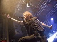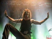 Le premier gros morceau de la soirée arrive. SANCTUARY, comprenant notamment les ex-Nevermore Warrel Dane et Jim Sheppard, débute fort avec le titre "Arise And Purify", single du dernier album "The Year The Sun Died", sorti en Octobre dernier. Le son n'est pas parfait, mais tendra à s'améliorer sensiblement durant le set. De gros pains surviennent au début du concert, faisant horriblement cracher les enceintes mais cela ne durera pas. Excellents guitaristes, Lenny Rutledge et Nick Cordle, membre live de luxe (aux mains monstrueusement rapides), nous en mettent plein les yeux et les oreilles, les soli véloces, mélodiques et passionnants tombent sur nous comme une pluie torrentielle ("Frozen"). Warrel Dane est très en voix ce soir. Ses lignes de chant, empreintes de théâtralité, sont toujours justes et puissantes. On sent qu'il ne se contente pas de chanter ses paroles, il les interprète également. Le concert est logiquement axé sur le petit dernier (5 chansons sur les 11 du set). Plus groovy et modernes, plus progressifs dans l'esprit (l'épique "The Year the Sun Die", très beau moment aux parties leads marquantes), ces morceaux démontent tout sur leur passage. L'interprétation y est sans faille. Mais SANCTUARY n'en n'oublie pas moins quelques classiques, dans une veine power / heavy metal old school, issus de ces deux premiers albums, dont "The Mirror Black", "Die For My Sins" et "Battle Angels". Côté négatif, on regrettera la trop grande nonchalance (voir le je-m'en-foutisme) de Warrel Dane, visiblement très peu impliqué et ne daignant même pas le cacher. Ses interventions entre les morceaux laissent transparaître dédain et suffisance ("De toute façon, vous ne comprenez pas ce que je dis car je parle anglais beaucoup trop vite pour vous..."). Un comportement irrespectueux envers les fans français présents ce soir qui voient sûrement le groupe pour la première fois. Pris de plusieurs quintes de toux entre certains titres, le blond vocaliste est sûrement malade, ce qui peut expliquer certaines choses. On lui laissera donc le bénéfice du doute. On pourrait reprocher aussi le côté "figuratif" de Sheppard et Rutledge, qui ne dégagent aucune passion (celui qui semble le plus s'amuser est Cordle, musicien intérimaire...). Encore une chose : la prochaine fois, il faudra dire à Dane, lorsqu'il hurle, de placer le micro devant la bouche et non devant le nez, s'il on veut capter la moitié des paroles et apprécier son chant. Ceci étant dit, on a assisté à un très bon concert, musicalement irréprochable. Un show d'une heure dont on n'a pas vu passer les minutes.