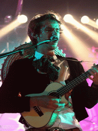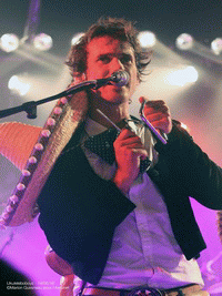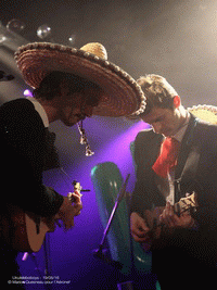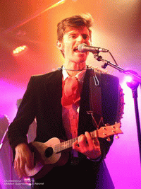 Étant désormais un jeune homme svelte, je n'ai pas besoin de rentrer le ventre pour me faufiler près de la scène, entre les gosses et les nombreux photographes, qui semblent venir uniquement pour mitrailler d'ailleurs, puisque certains partiront bien avant la fin de la soirée... Bref, les UKULELEBOBOYS ouvrent le bal, sur un joli décor composé d'un agréable cactus gonflable. Concept on ne peut plus simple : deux mecs qui chantent, jouent du ukulele, le tout en se faisant passer pour des Mexicains. Clairement, on m'aurait dit ça, j'aurais répondu : "nul, casse-toi". Mais j'avais déjà apprécié les quelques vidéos d'eux que j'avais vues, ça m'avait l'air cool et rigolo. J'ai un peu de mal au début, les deux premières chansons sont clairement molles, en plus en anglais, bof. Mais plus leur prestation progresse, plus la bonne ambiance envahit le public, et on a droit à de très jolies reprises, comme "Hotel California" ou "Eye Of The Tiger", toujours avec l'accent mexicain. Par ailleurs, même si en temps normal je déteste ça, j'ai ici adoré les petites notes d'humour entre les morceaux, c'était réussi et bien dosé.