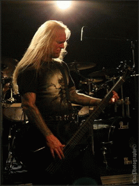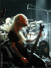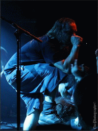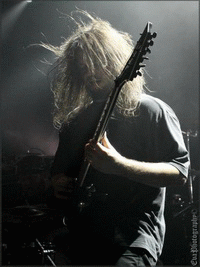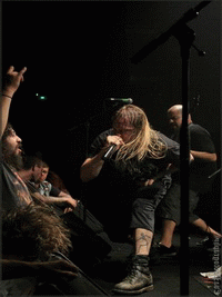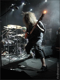 Et nous finissons en beauté avec SUFFOCATION, THE groupe de la soirée, celui tant et tant attendu par les fans venus en masse pour les applaudir (ou du moins, pour les soutenir) parce qu’ici ce ne sont pas les applaudissements qui ont eu lieu, mais bien les cris, slams, pogos, pit etc. Nouveau batteur pour le groupe depuis peu, et nouveau chanteur éphémère ! Effectivement, il s’agit de Bill Robinson, qui a remplacé Frank ce soir, allez savoir pourquoi, je n’en ai pas la moindre idée. Celui-ci couvert des dreadlocks, longs et blonds, lui offrant un look viking, viril, dominant et imposant (rien que ça !). Et puis le guitariste Terence, ses dreads à lui sont semblables à des tentacules ! Une pieuvre dégarnie.. Mais sinon il faut avouer que Bill s’est bien défendu ce soir sur scène, et que les autres musicos l’ont bien intégré. Les mecs plus déchaînés que jamais ont perdu la raison, ne laissant que leur rage parler, donnant lieu à un carnage plutôt violent dans la fosse. Quand le groupe a quitté la scène, les fans les ont implorés, entraînant un rappel de leur part. Terence est donc revenu avec ses fameuses lunettes, assurant le dernier titre du set. Et voilà qu’à 00h15 cette soirée death s’est achevée, après qu’elle eut achevée elle-même les nombreux spectateurs présents ce soir-là.