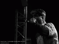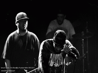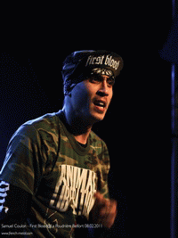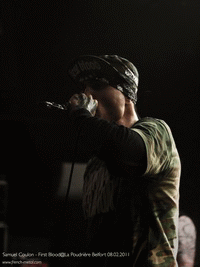 J'arrive dans la Poudrière pile poil pour FIRST BLOOD. Bandanas, casquettes et autres tee-shirts à la gloire des groupes Américains fleurissent de droite et de gauche. Dernières consignes à l'entrée comme quoi les groupes "déclinent toute responsabilité en cas de coup de pied, coup de poing, crachat et/ou bière..." pas trop rassurant tout cela. La précision des "trois premiers morceaux sans flash" pour les photos sera bien inutile. Ne disposant pas de fosse à proprement parler, la Poudrière est une vraie fournaise, et prendre quelques photos relève plus de la mission suicidaire qu'autre chose.