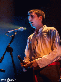 Pour ouvrir ce groupe, les Espagnols d’ÀRNICA et leur belle collection de tambours. J’ai rarement autant rigolé devant un groupe, je vous le confesse. Déjà parce que la totalité des morceaux étaient pluggés, comprenez par là qu’en arrière-plan on pouvait apercevoir un PC branché qui balançait les instrus alors que les trois braves au talent incertain se lançaient dans des leçons simplistes de tambourins.